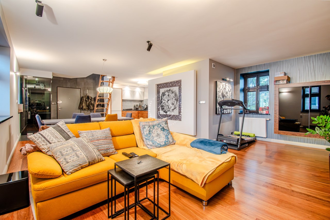 Dwupoziomowy lokal z kondygnacją poddaszową to przestrzeń o wyjątkowym charakterze i ponadprzeciętnej funkcjonalności. Powierzchnia całego lokalu, liczona po podłodze przekracza 100 m², a dzięki wysokim ścianom kolanowym (ok. 160 cm) poddasze jest w pełni użytkowe i bardzo komfortowe w codziennym korzystaniu.