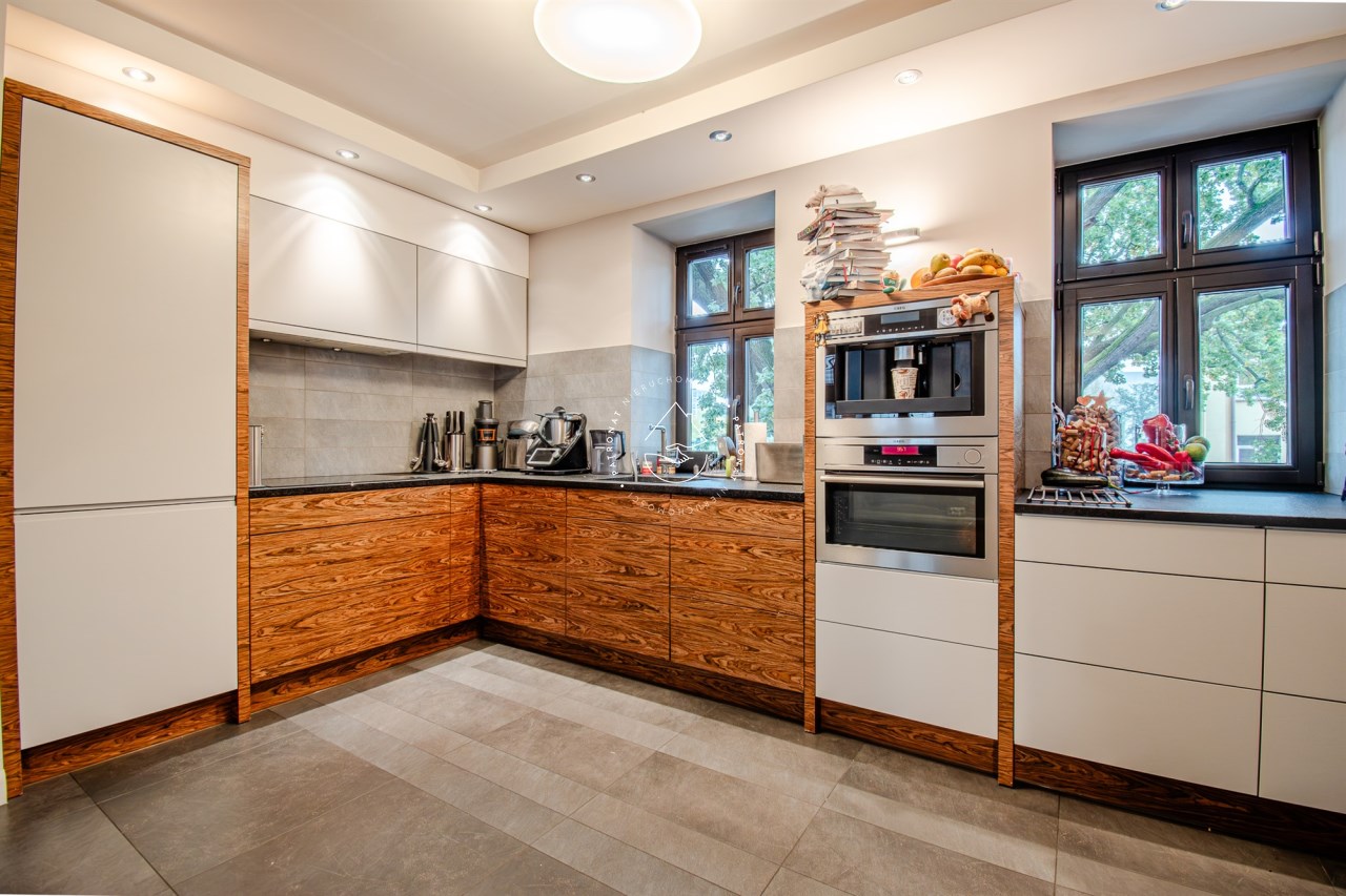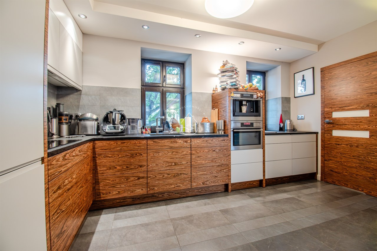 Kuchnia została wykonana z połączenia płyty meblowej, litego drewna i granitowych blatów, które podkreślają wysoką jakość wykończenia. Wnętrze wyposażone jest w sprzęty AGD, a wszystkie okucia pochodzą od renomowanej marki BLUM. Granitowe parapety oraz spójna kolorystyka materiałów dopełniają całość, tworząc harmonijną przestrzeń, w której nowoczesność łączy się z ponadczasową elegancją.