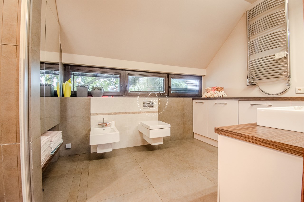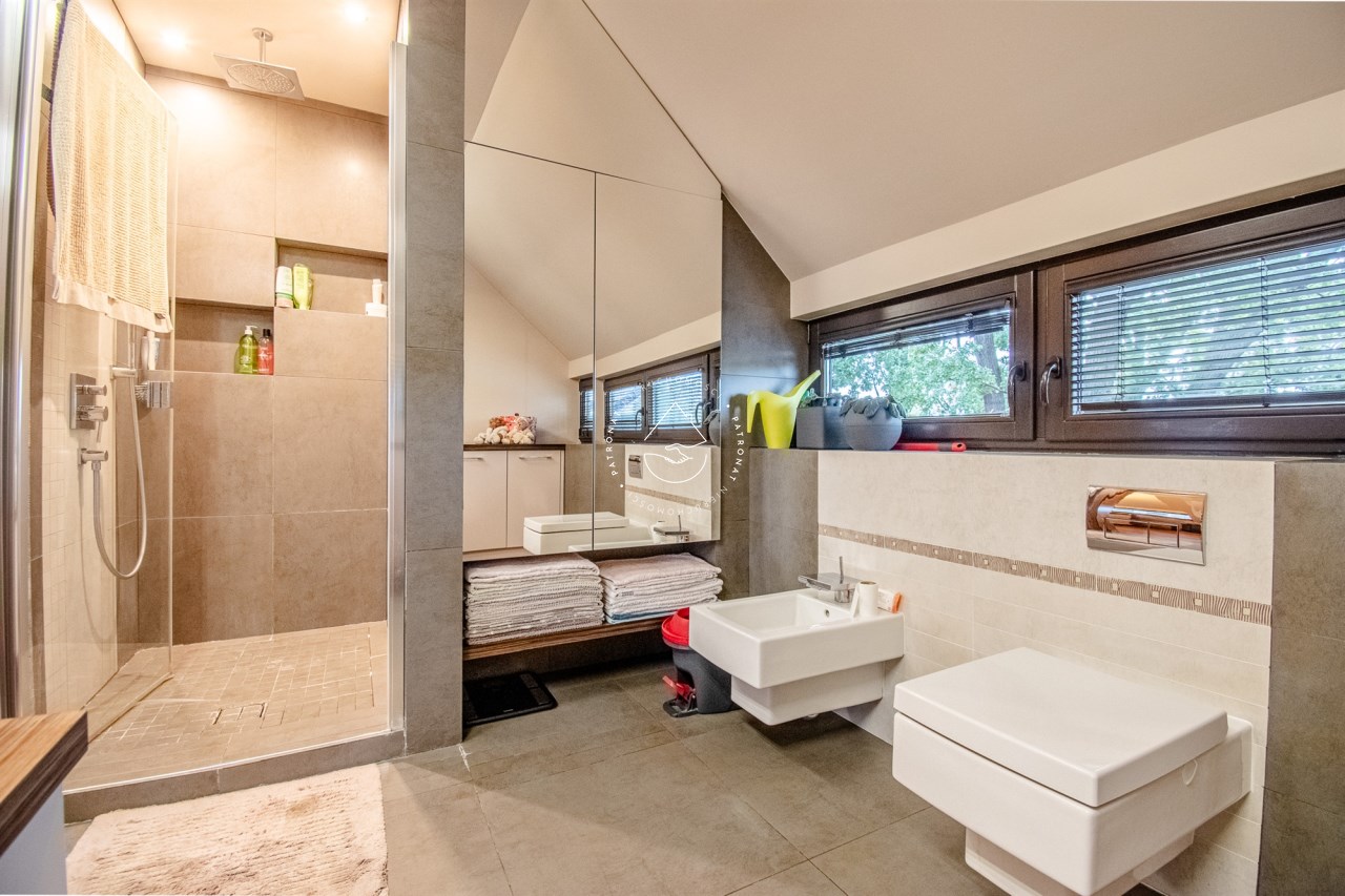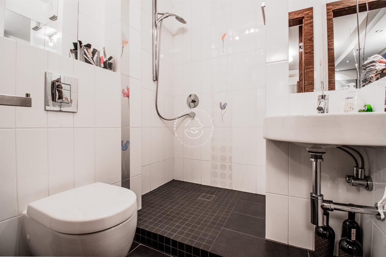 Na dolnym poziomie znajduje się imponująca, otwarta przestrzeń dzienna o powierzchni ponad 50 m², łącząca salon, aneks kuchenny oraz strefę jadalnianą i wypoczynkową. Na tym poziomie znajduje się również mała łazienka z prysznicem. W strefie kuchennej i łazienkowej zastosowano ogrzewanie podłogowe, a w pozostałych pomieszczeniach – klasyczne grzejniki.