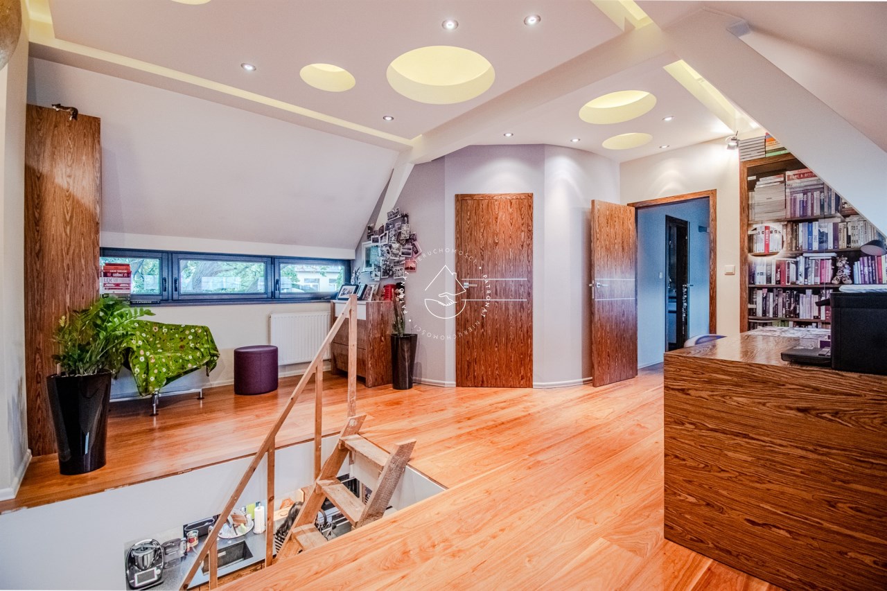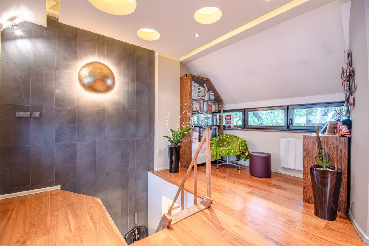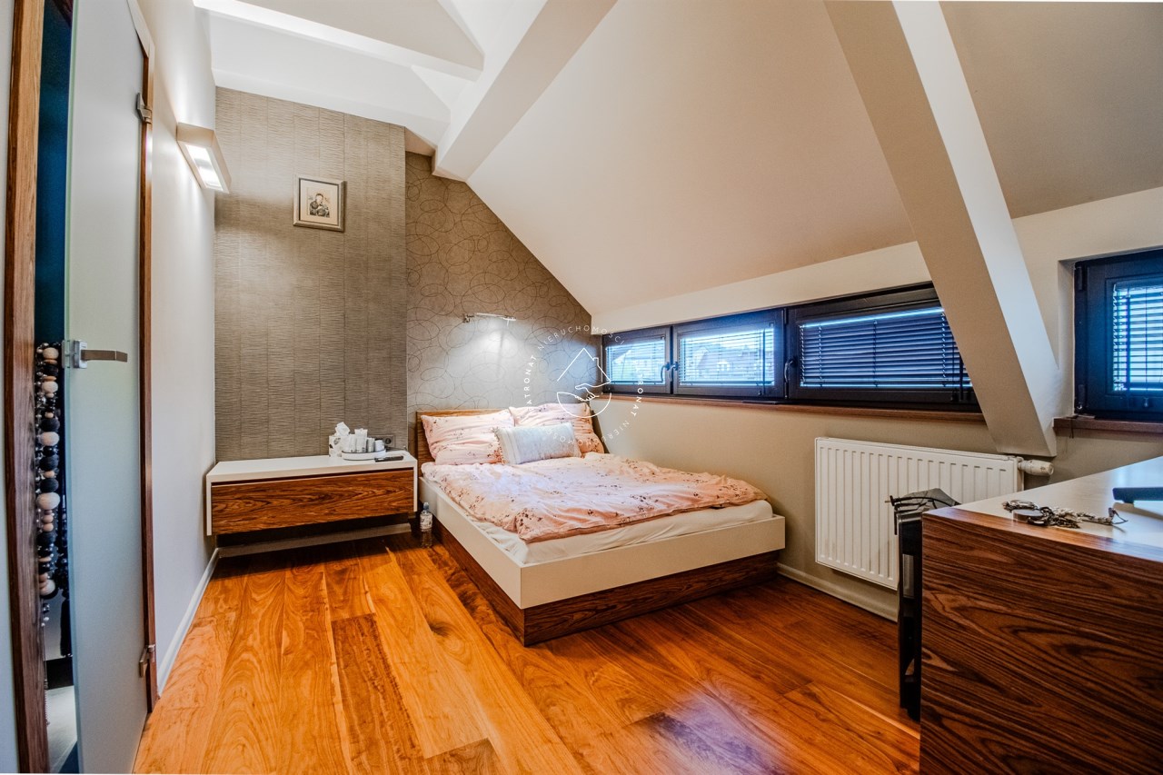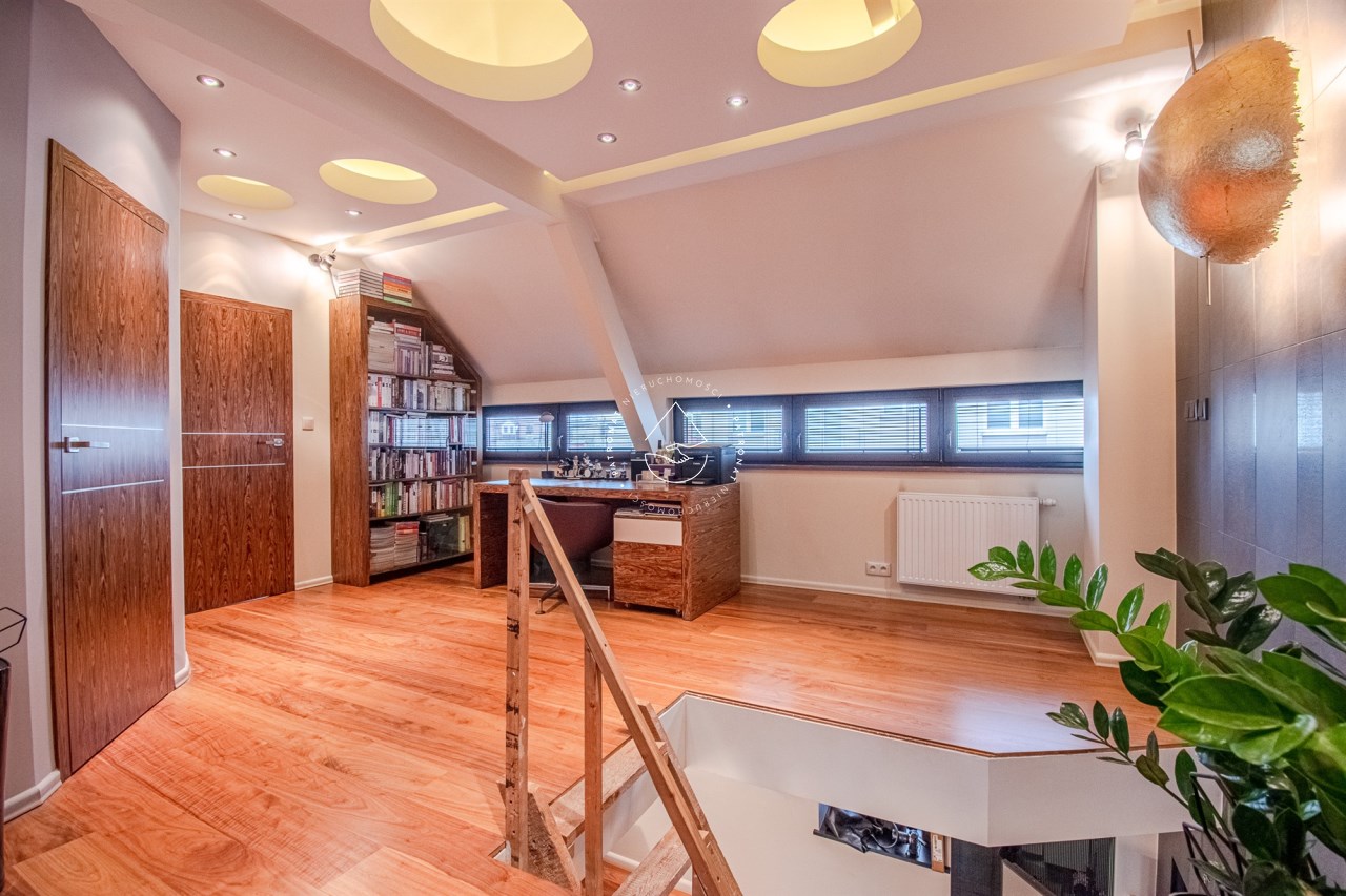 Górny poziom stanowi nastrojową, otwartą antresolę zaadaptowaną na stylowe miejsce do pracy lub relaksu. Drewniane zabudowy, półki i biblioteczki nadają jej wyjątkowego charakteru i przytulności. Z antresoli prowadzi wejście do garderoby oraz do wydzielonej sypialni z dostępem do przestronnej łazienki z ogrzewaniem podłogowym.