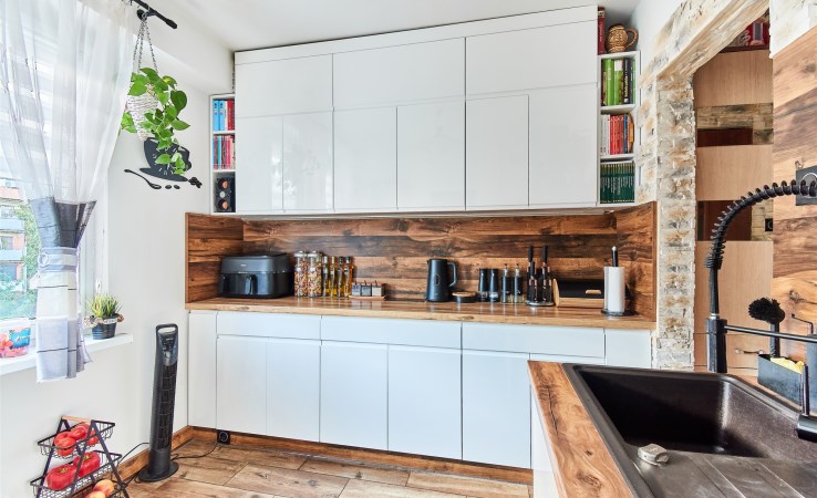 Wyposażenie kuchni | piekarnik, okap kuchenny, zlewozmywak z baterią, płyta gazowa, meble kuchenne na wymiar, lodówka |