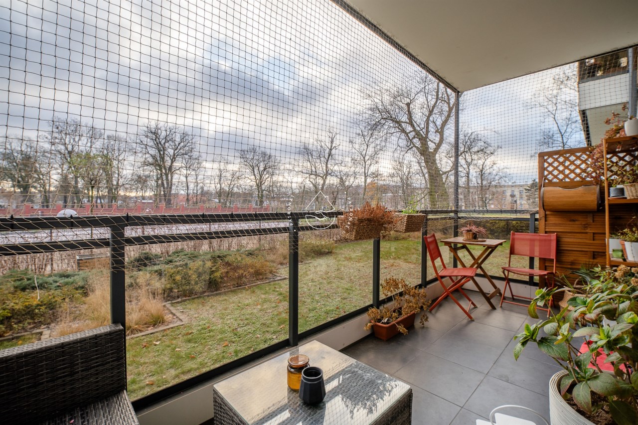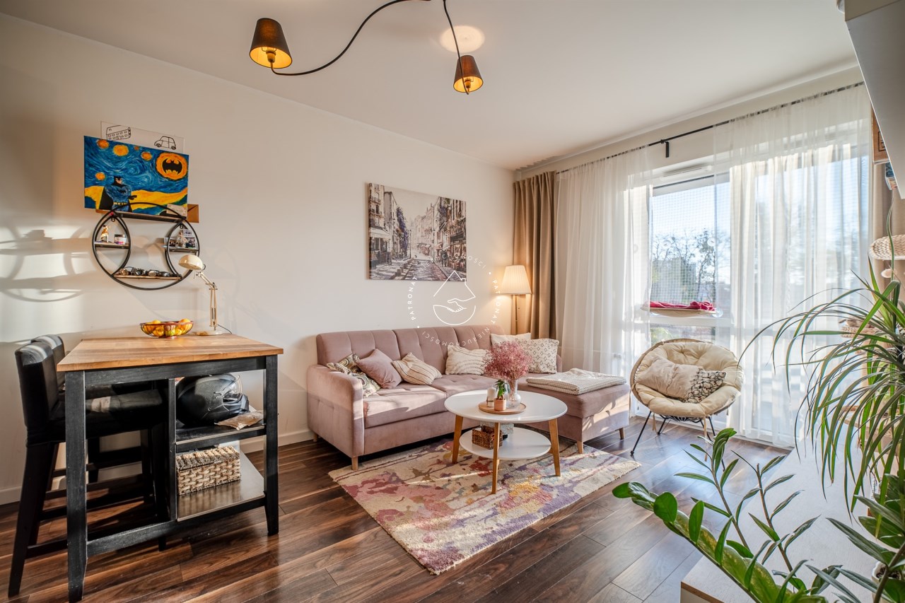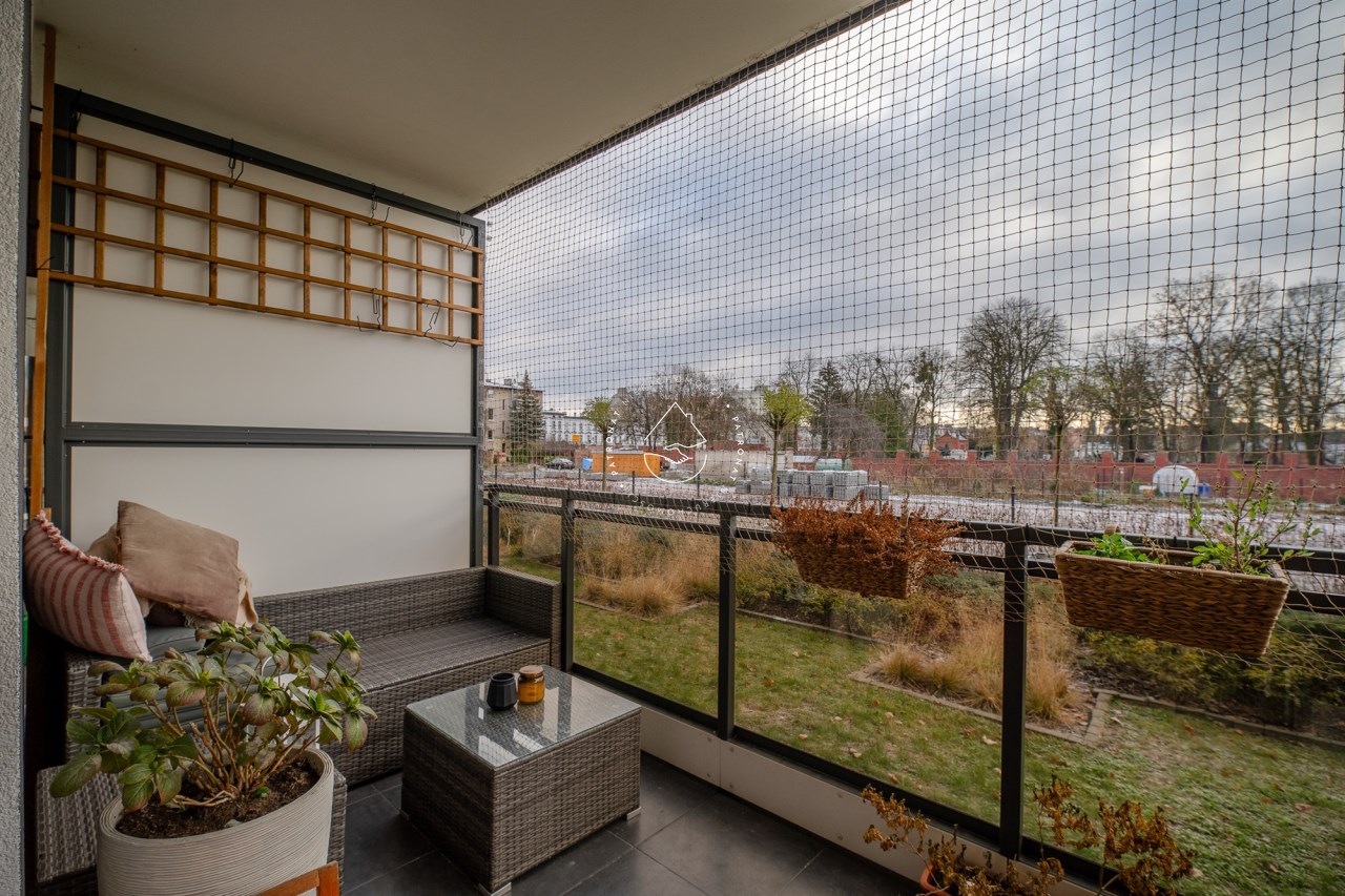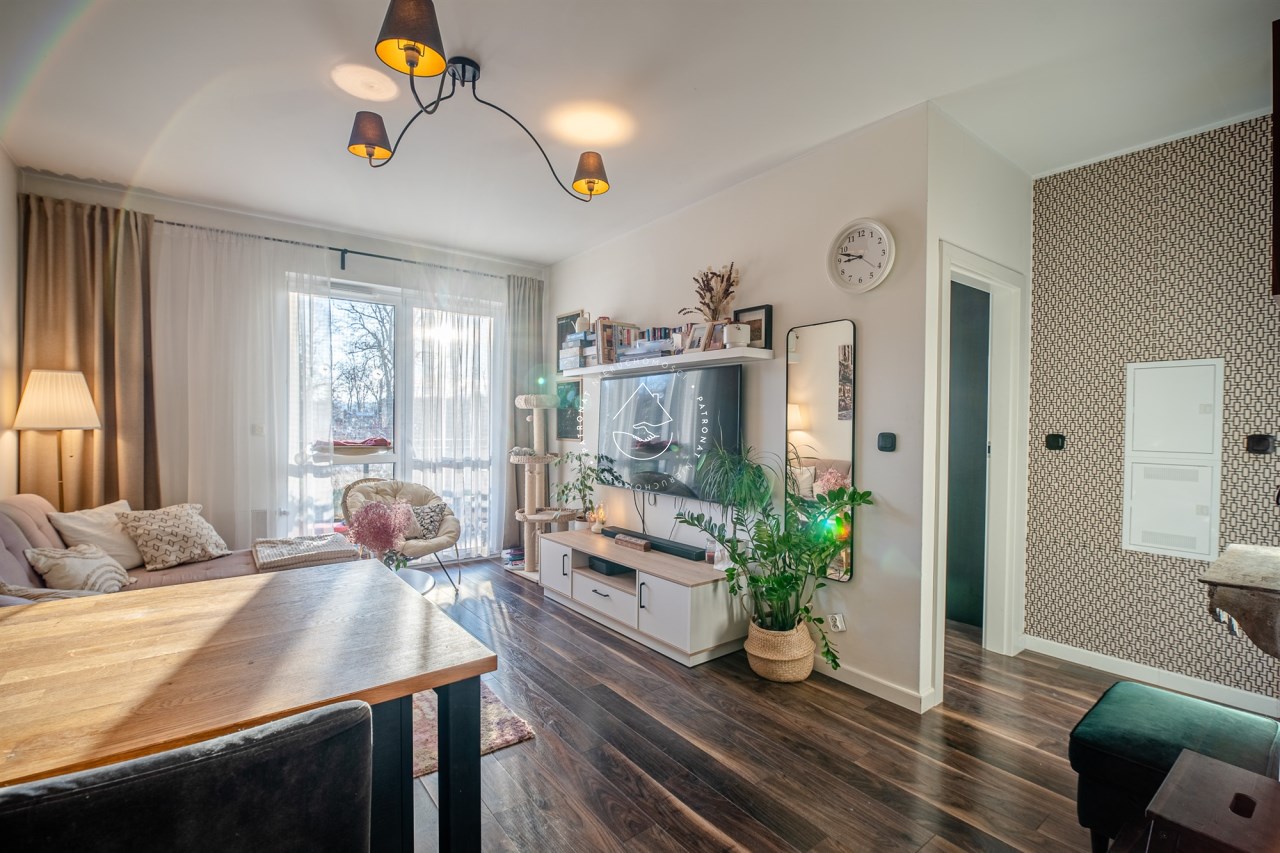 Mieszkanie mieści się na parterze, powierzchnia używkowa wynosi 40 m2. W skład metrażu nieruchomości wchodzą: salon z aneksem kuchennym, sypialnia, łazienka i przedpokój. Dodatkowo układ oferuje dostęp do przynależnego, dużego balkonu o powierzchni ponad 10 m2.